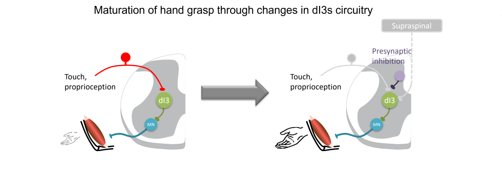 One circuit of interest in the mouse is centered on a population of spinal neurons named dI3 neurons (dI3 INs). DI3 INs integrate sensory information related to touch (mechanoreception) and state of muscle activity (proprioception) and in turn, they shape the activity of motor circuits within the spinal cord.