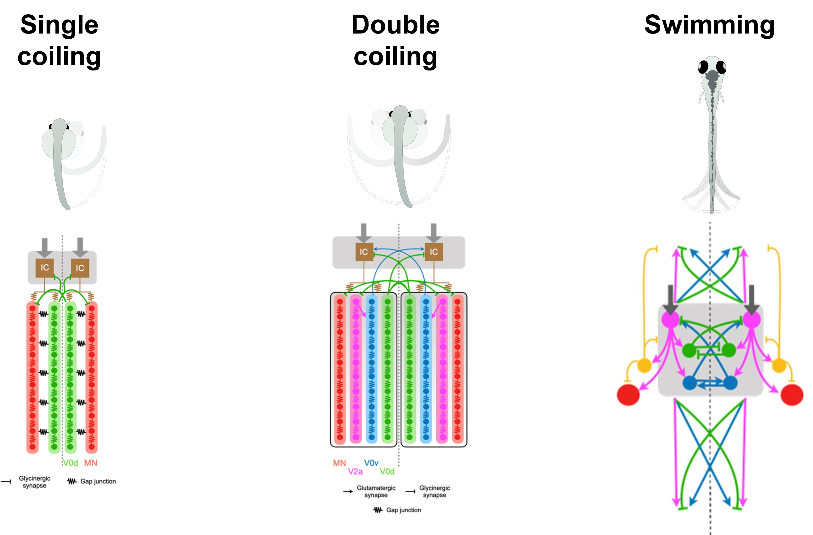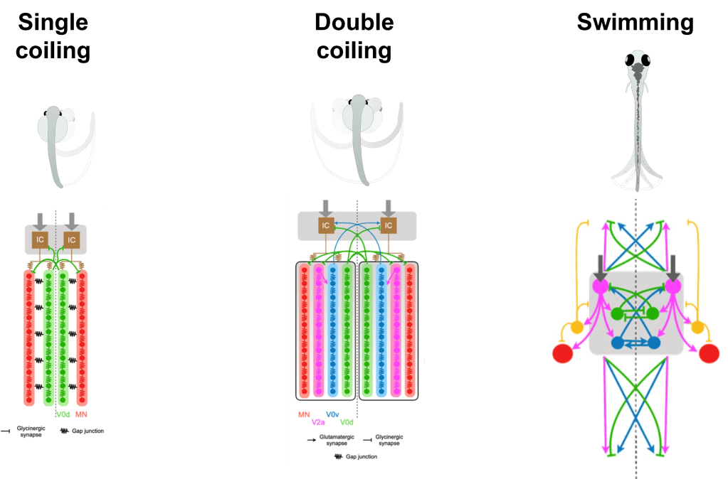 We have recently published a paper describing how the role of inhibition in the generation of swimming rhythm may change during development in larval zebrafish. A computational study from our lab also describes how the composition and the operation of spinal circuits for locomotion in zebrafish may be modified as fish start exhibiting different movements.